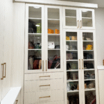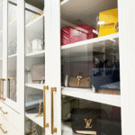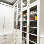 Inside, the closet is outfitted with premium shelving, soft-close drawers, and adjustable hanging sections tailored to the homeowner’s storage needs. Warm LED strip lighting illuminates each section, enhancing visibility and adding a sophisticated glow behind the glass.